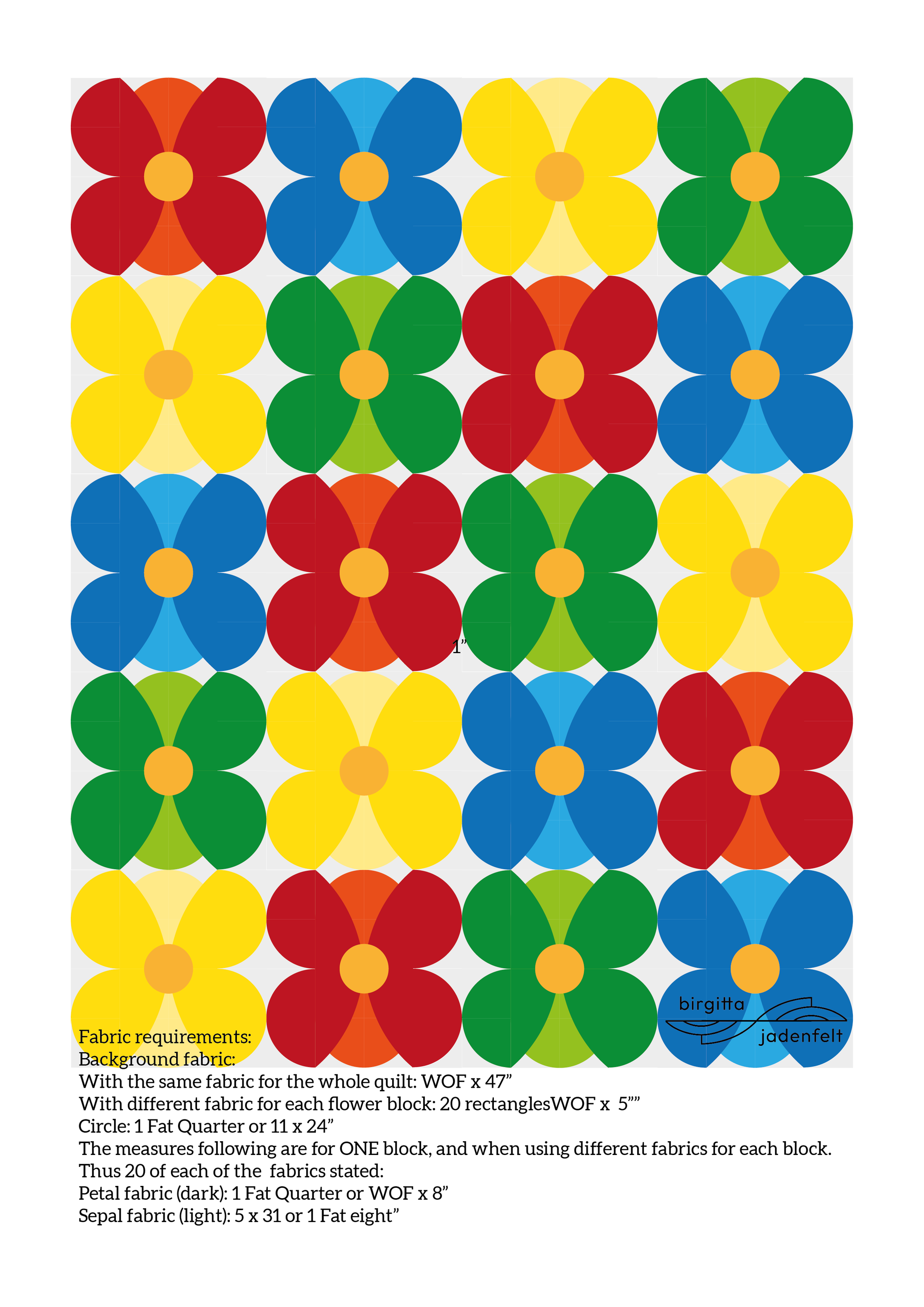 Pattern for quilt measuring 48 x 60 inch (122 x 153 cm). The pattern includes instructions and paper templates. You need to have basic skills in quilting, and also be able to sew a precise 1/4" seam. You need to master sewing curves.